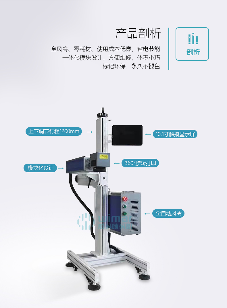 采用光纖激光器輸出激光,電光轉(zhuǎn)換率高,體積小巧,不需外部水冷卻設(shè)備,光束質(zhì)量好。光纖激光器先進(jìn)的固體激光器,使用壽命長(zhǎng),維護(hù)費(fèi)用低。觸摸飛行打標(biāo)系統(tǒng),操作方便,穩(wěn)定性高,運(yùn)行速度快,現(xiàn)行的3.0版系統(tǒng),是全球飛行打標(biāo)速度較快的系統(tǒng)之一。